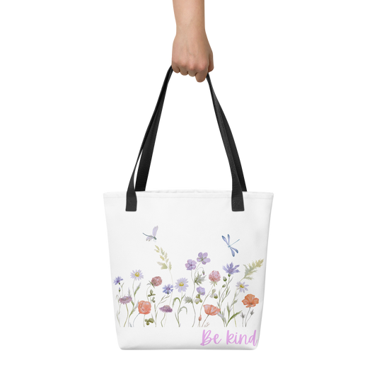 Be Kind Tote bag with wildflowers, 15" x 15," dual handles, trendy tote bag, wildflowers tote bag, tote bag, stylish tote bag