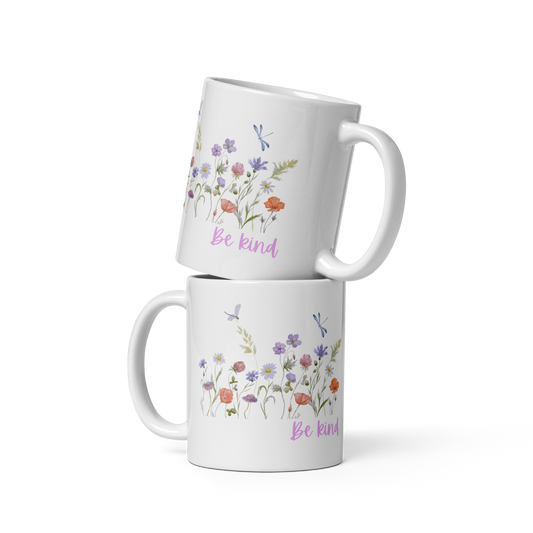 Be Kind White glossy mug with wildflowers for summer, spread kindness, kindness mug, coffee mug, be kind coffee mug