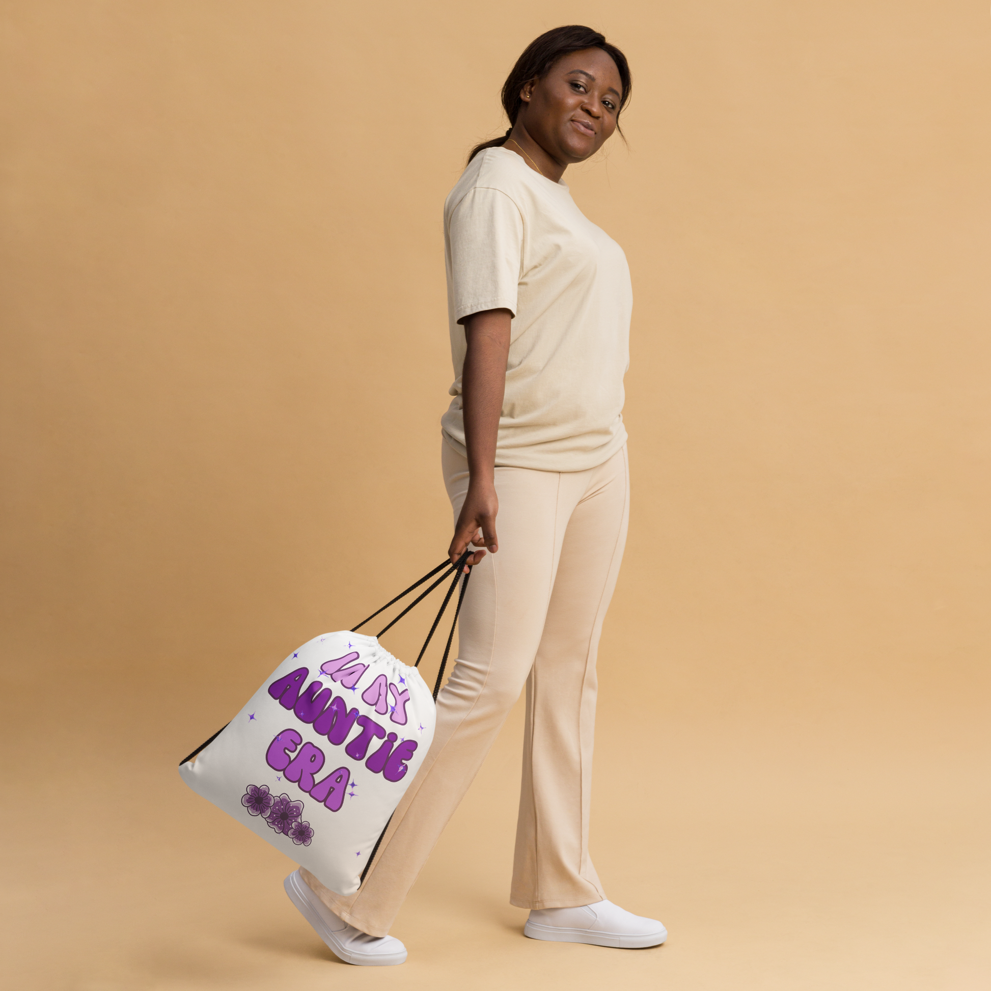 Elevate your everyday look with our drawstring bag that seamlessly combines both style and functionality, catering to the modern Auntie's needs and fashion preferences. Embrace the ease and chicness of the Auntie Era Drawstring Bag today and make a statement wherever you go!